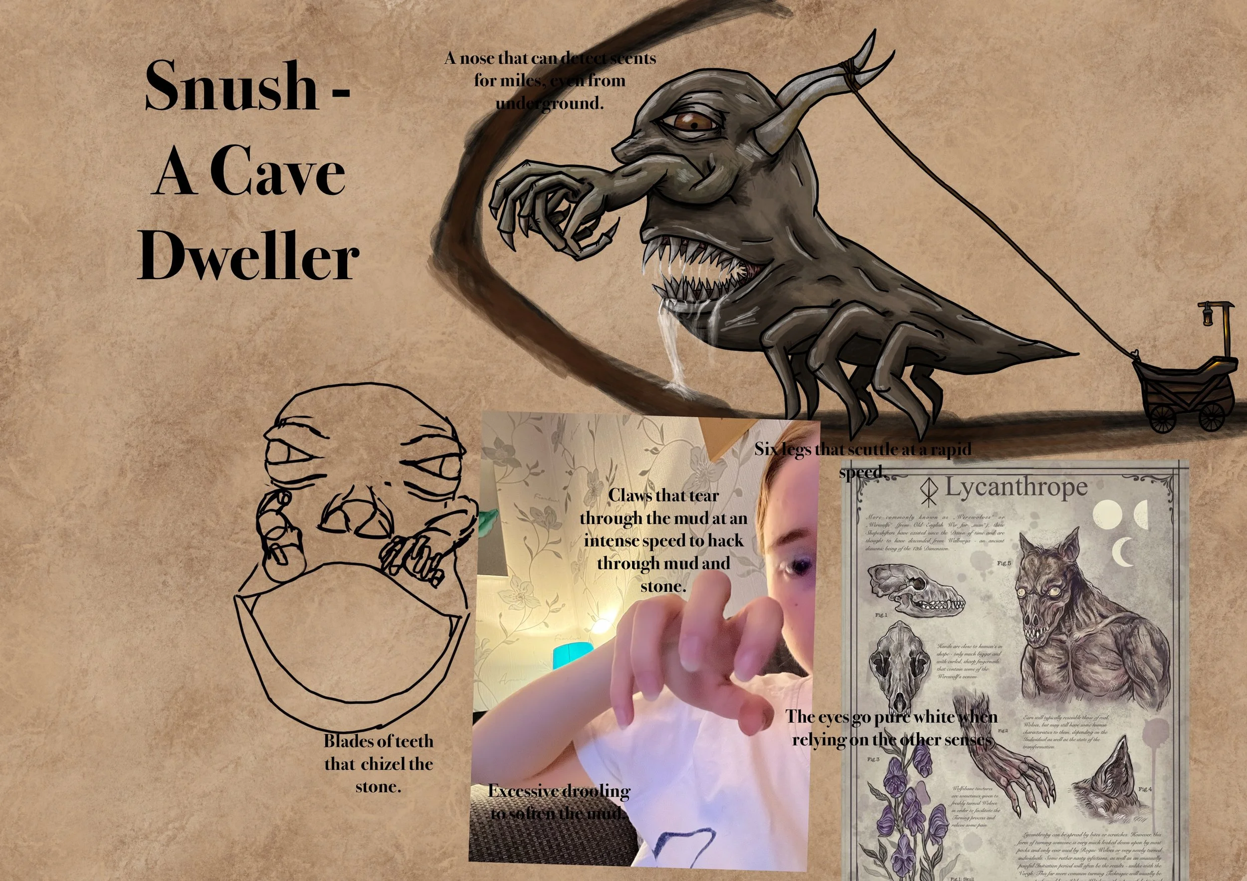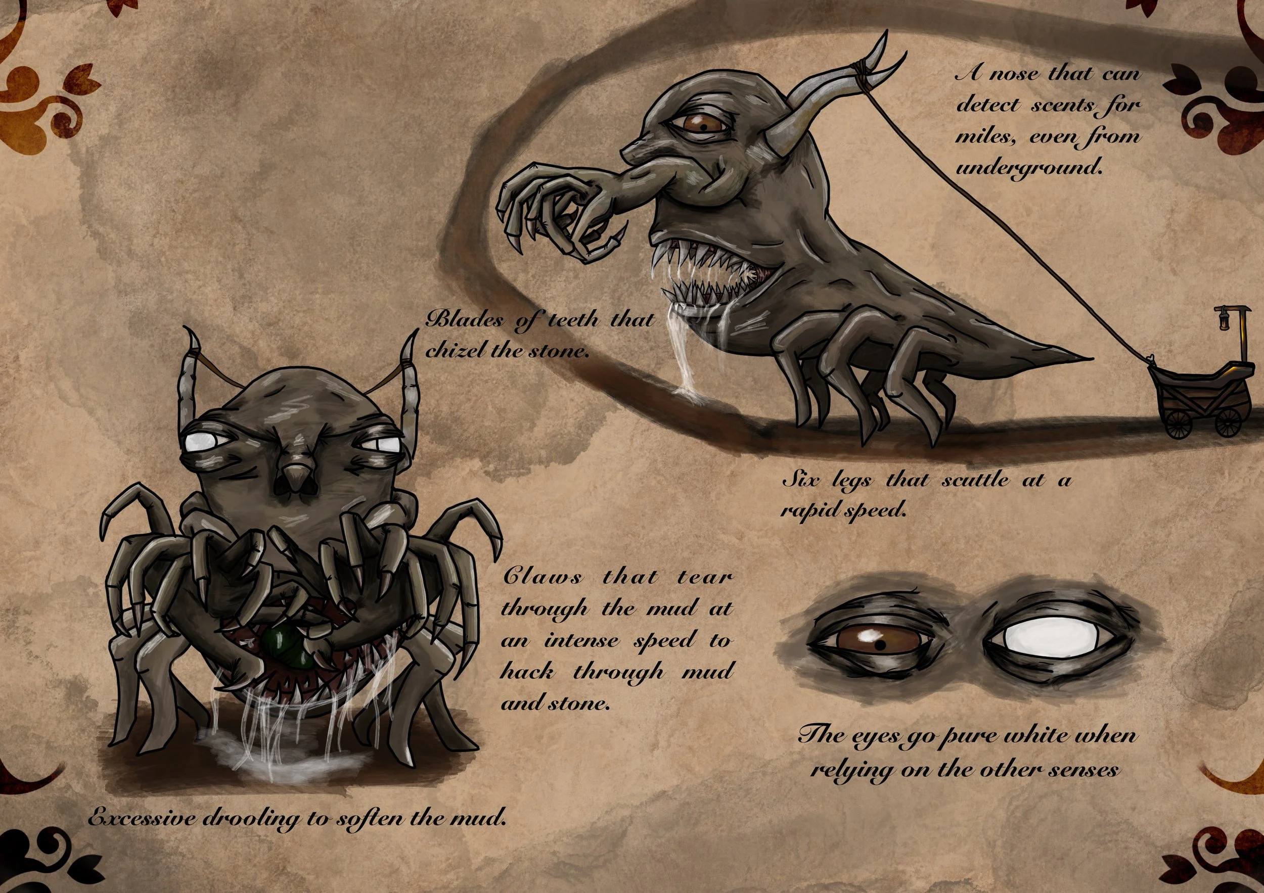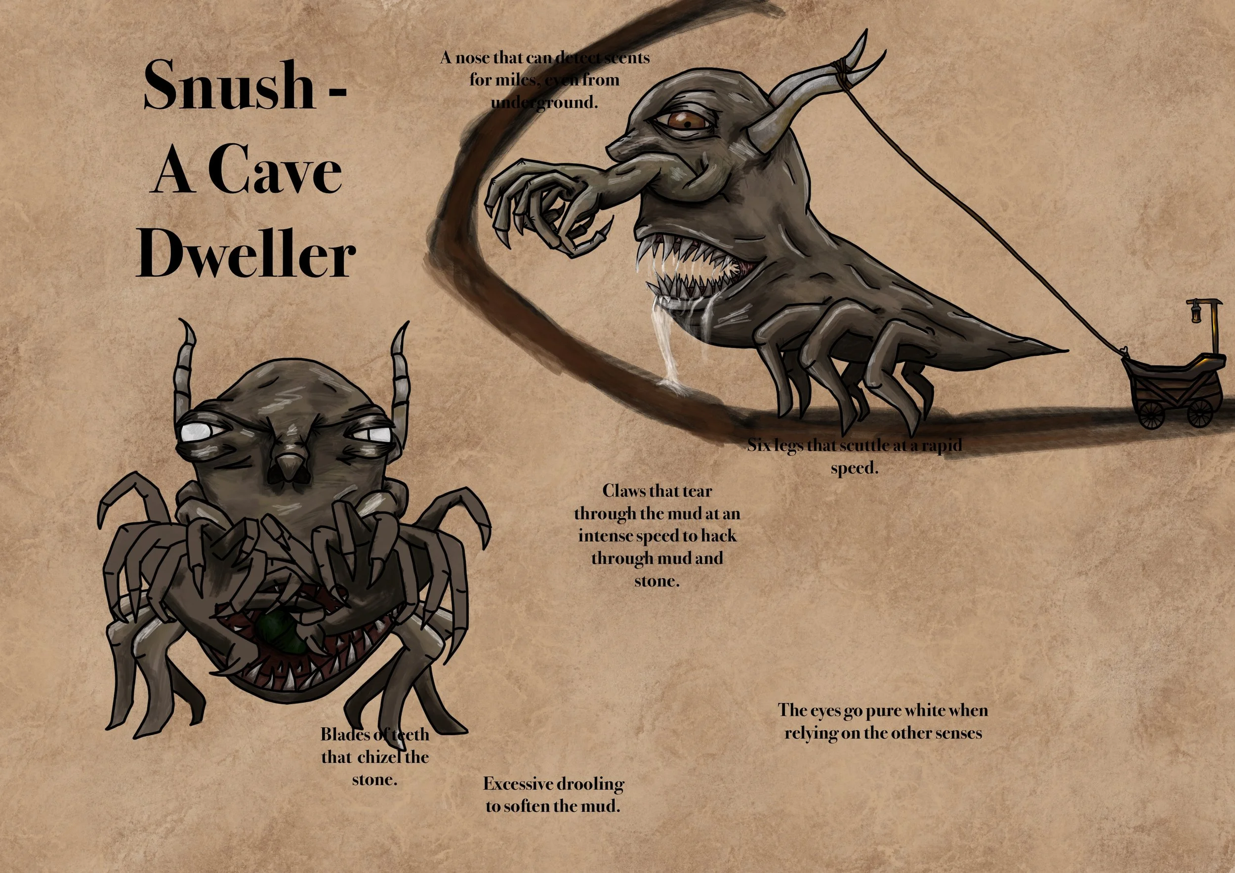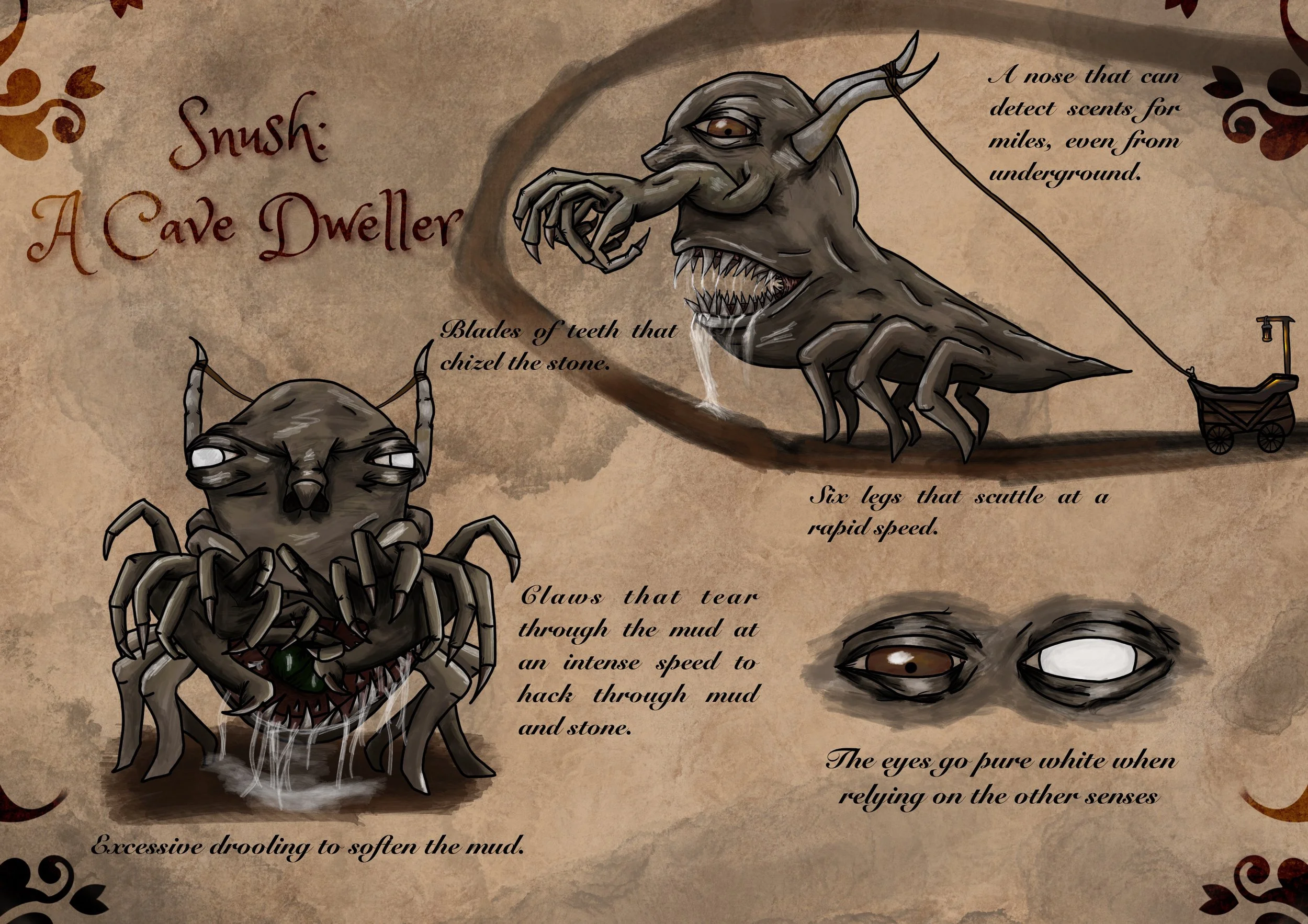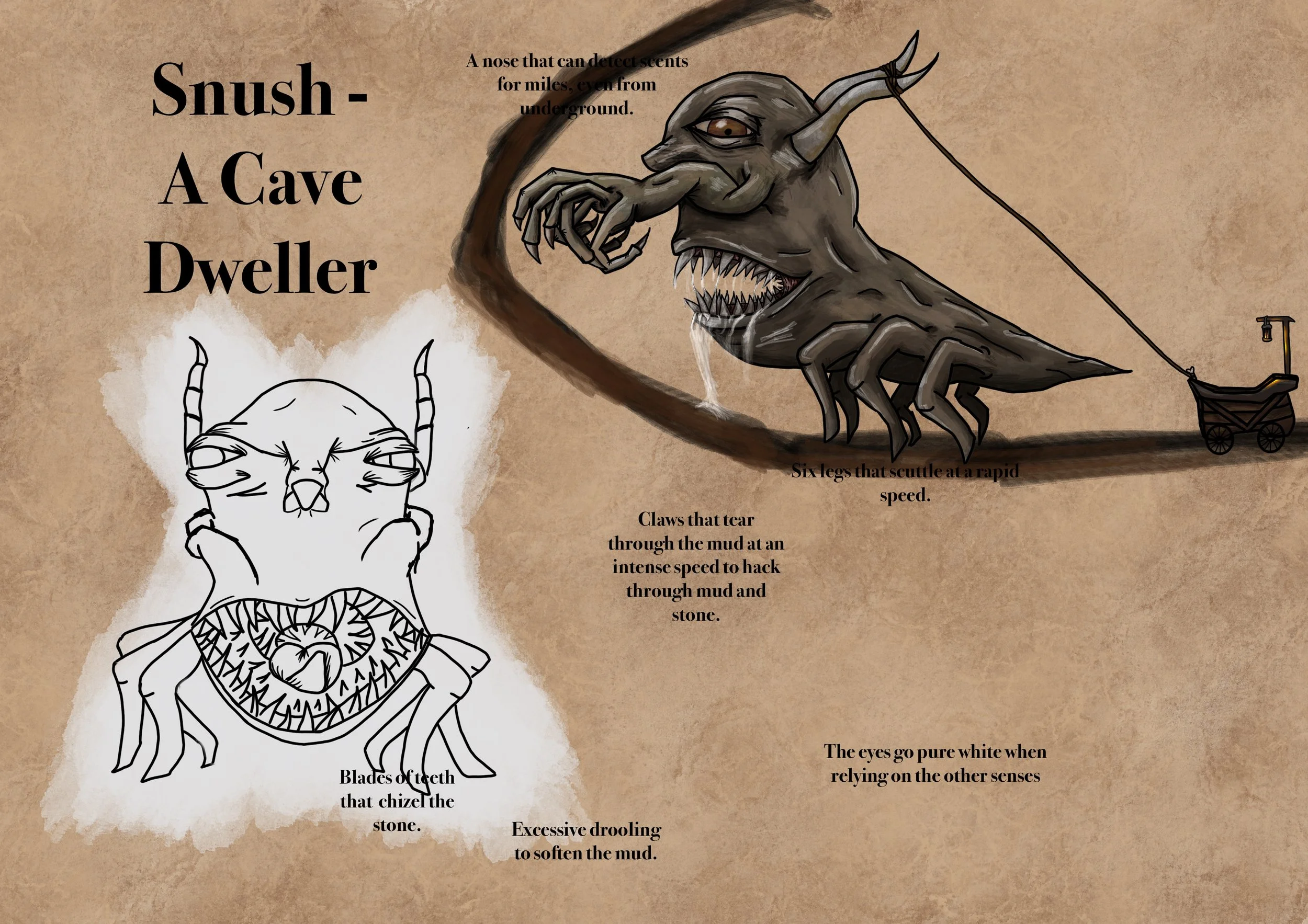As described in the analysis image, when the snush is tracking something, its eyes go completely white, blinding itself so it can focus on its other senses. It also contains many extra fingers with extreme cutting claws in order to hack through the mud that its excessive drooling softens. And if there are rocks too stubborn to push aside, then that’s where its expandable jaw of drilling teeth breaks the stone to fine rubble. Let’s just say, don’t walk in front of this creature when it’s tracking.