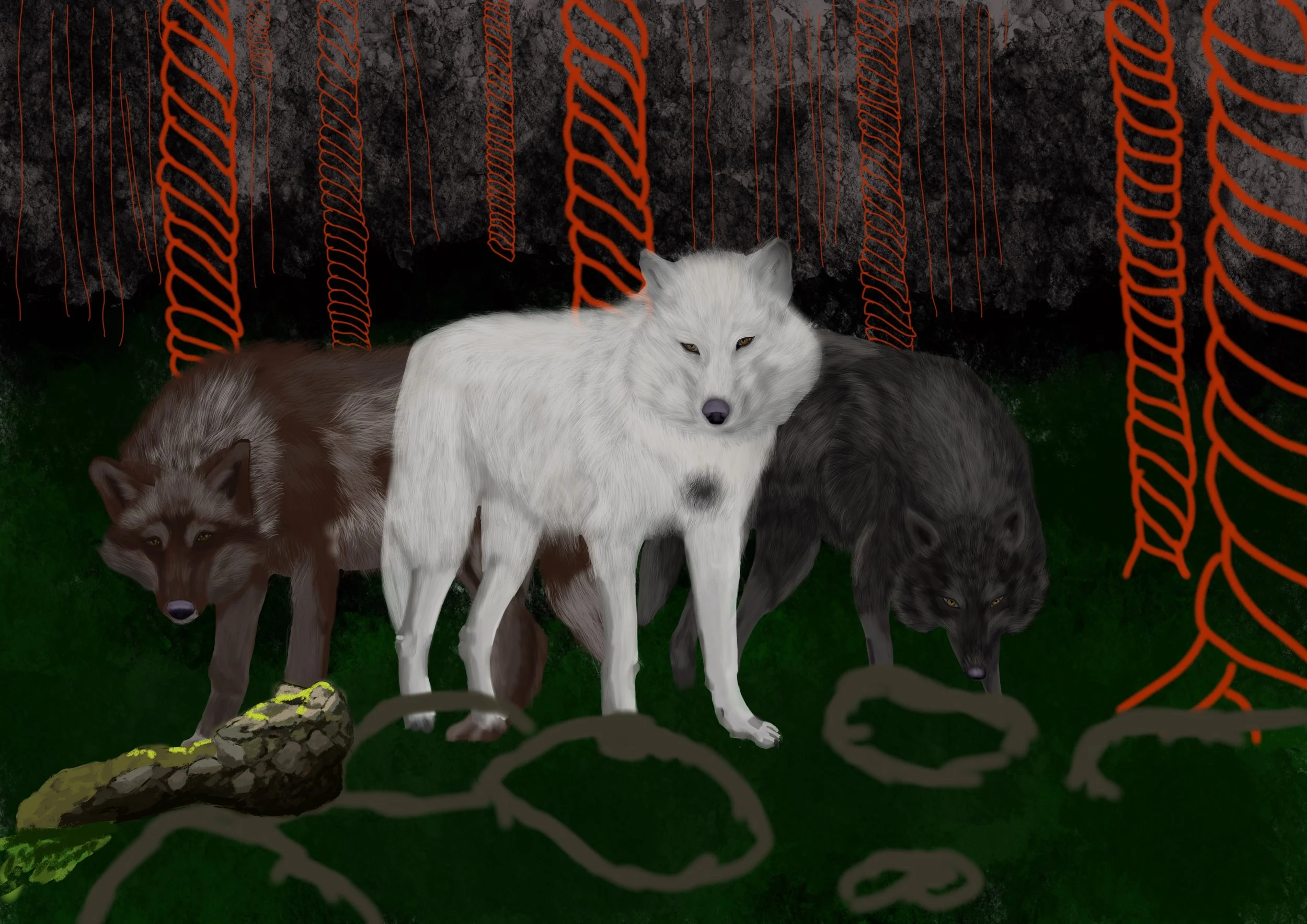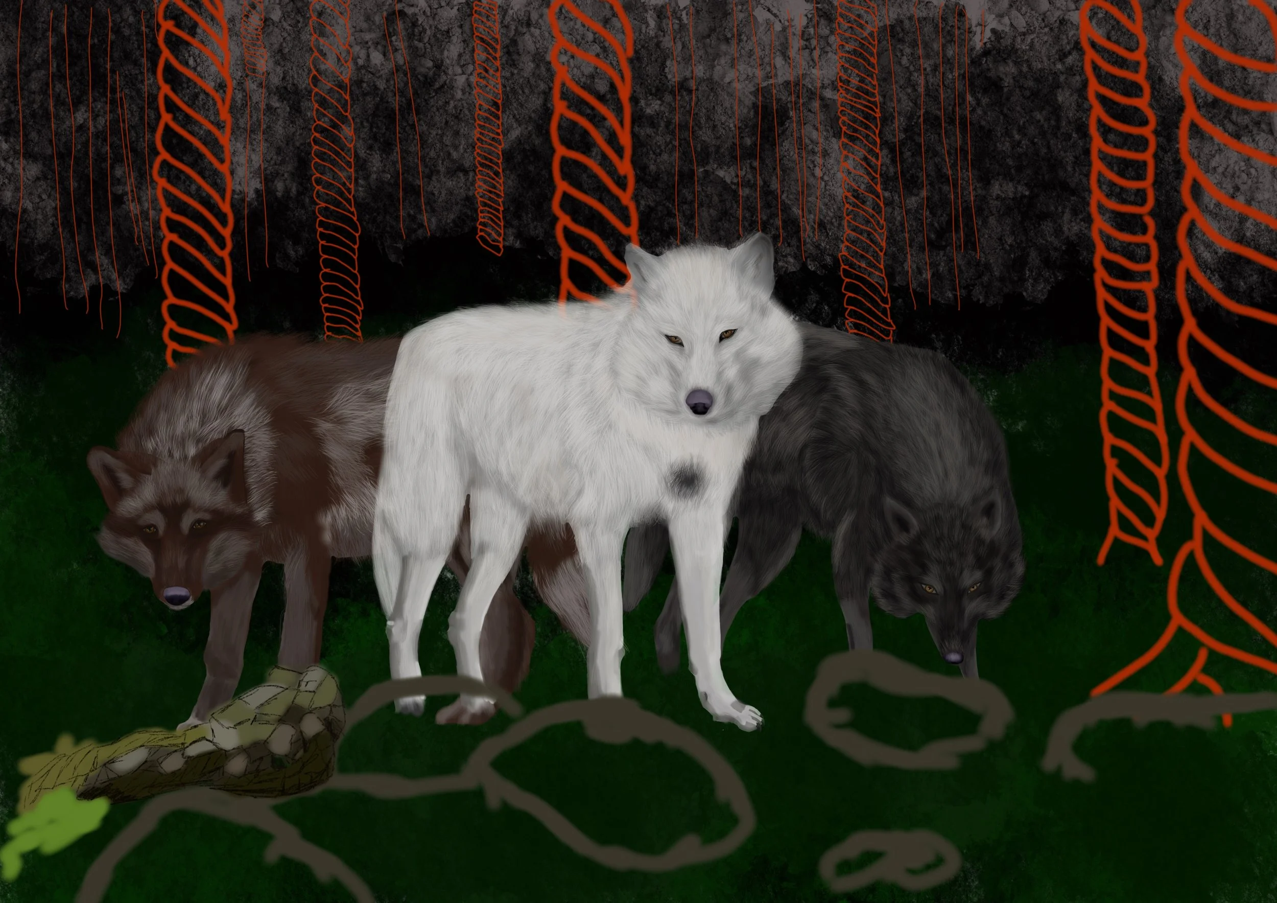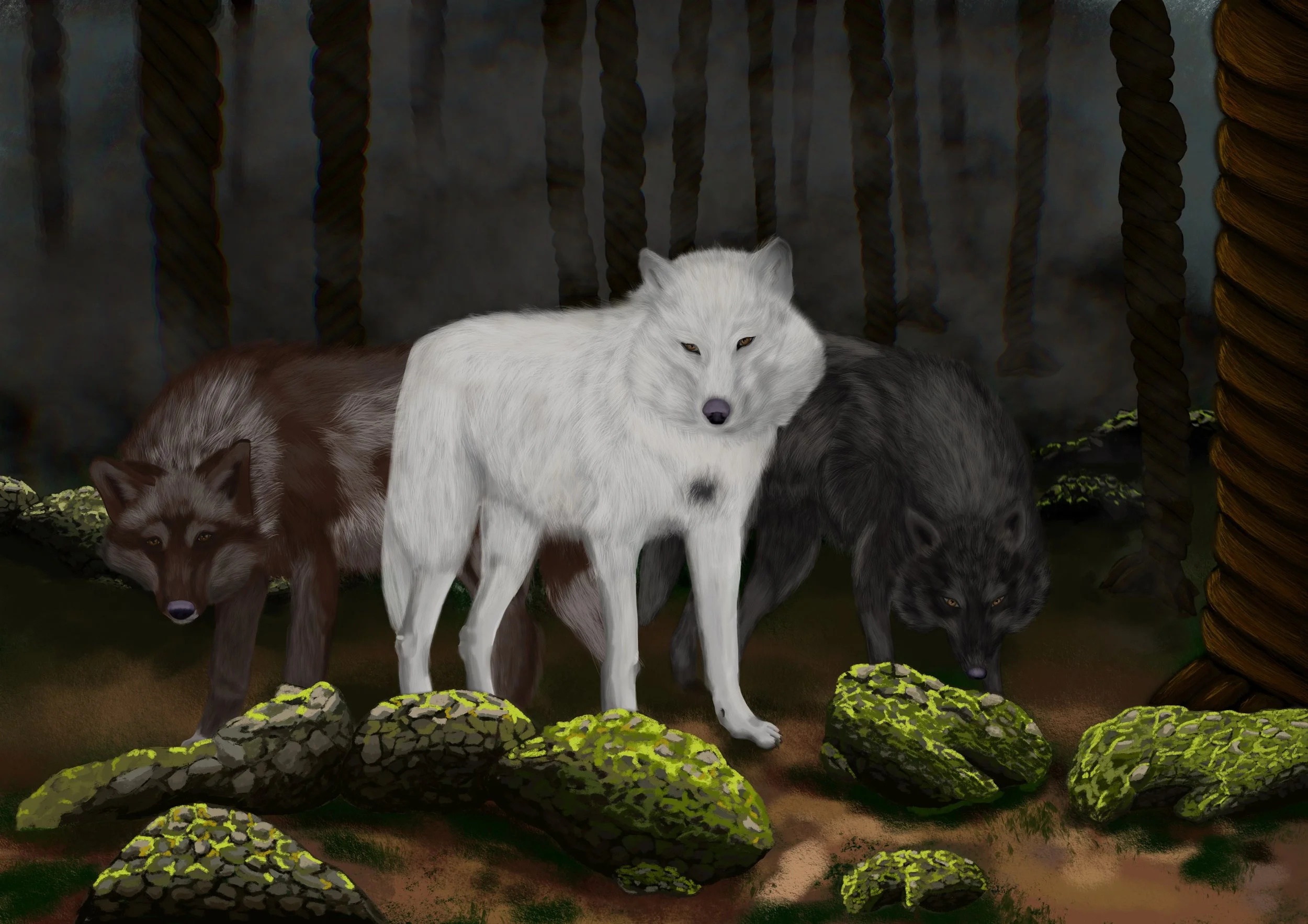 Three wolves, nothing too mysterious. Not until you understand that the white wolf has been robbed of his colour.