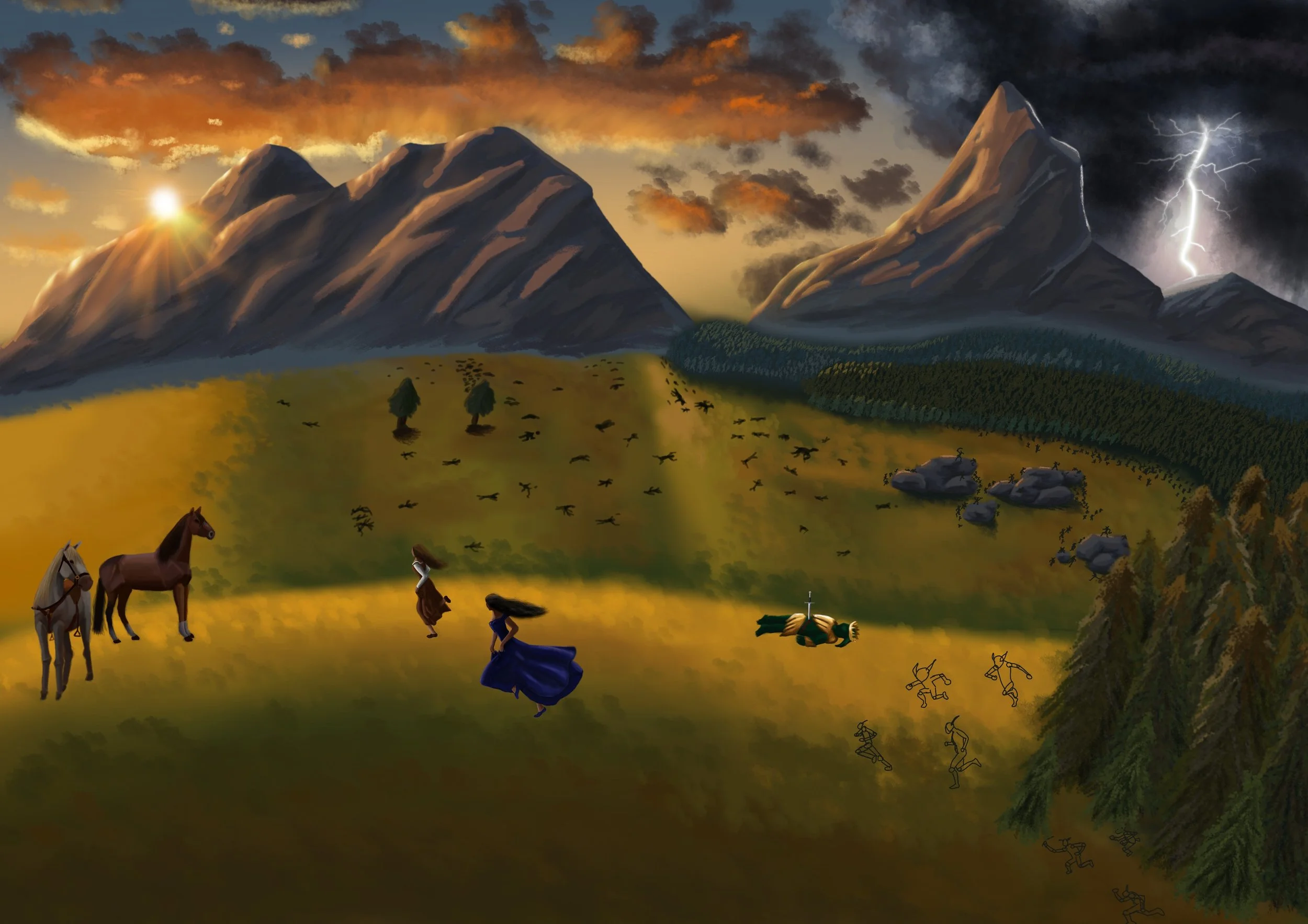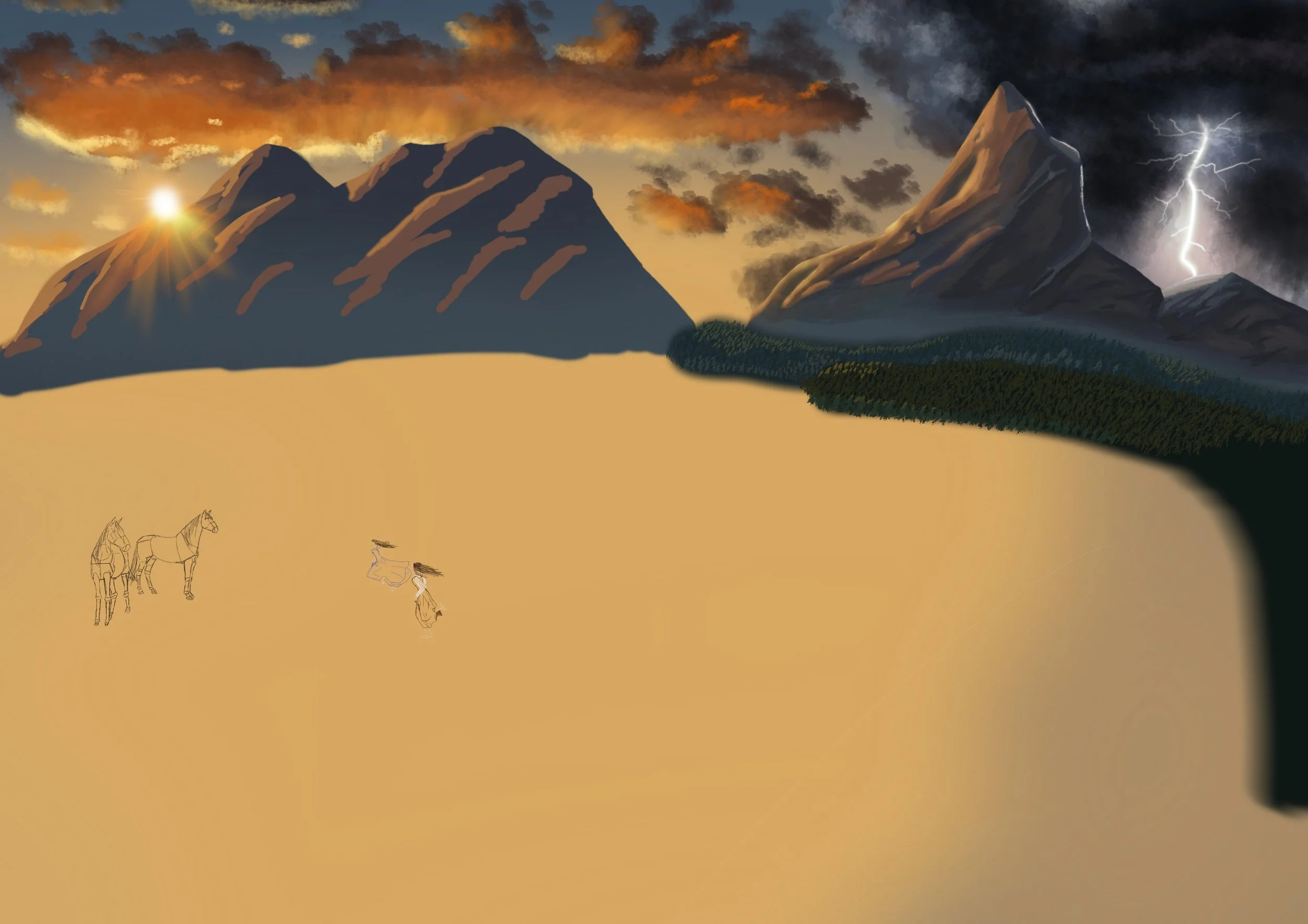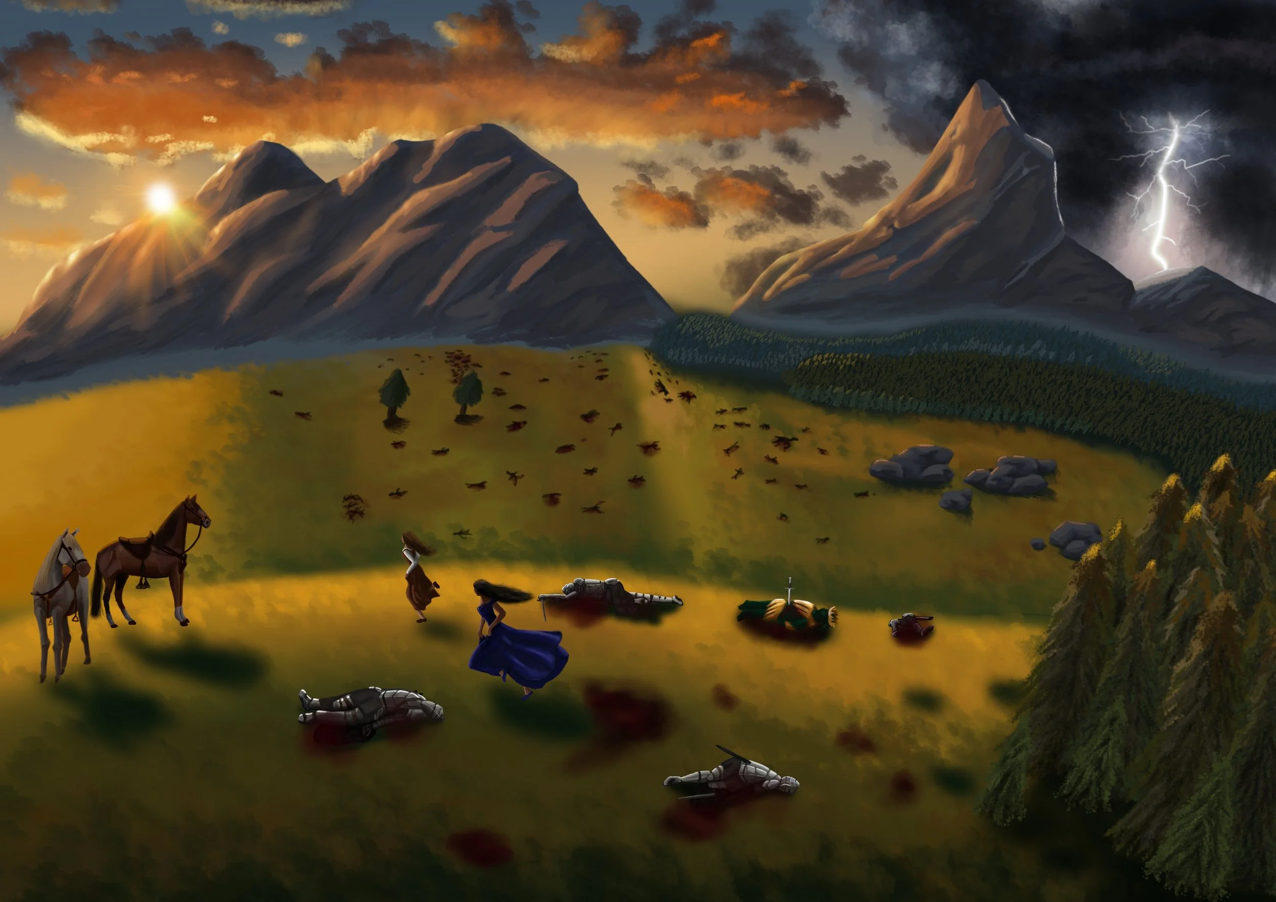 Alongside these things, I had a vision for one side being a beautiful sunshine and the other side to be dark, referencing the impending doom to follow. It mirrors the scene for the sudden drastic change to danger, as well as a contrast between a beautiful scene and a harrowing massacre.