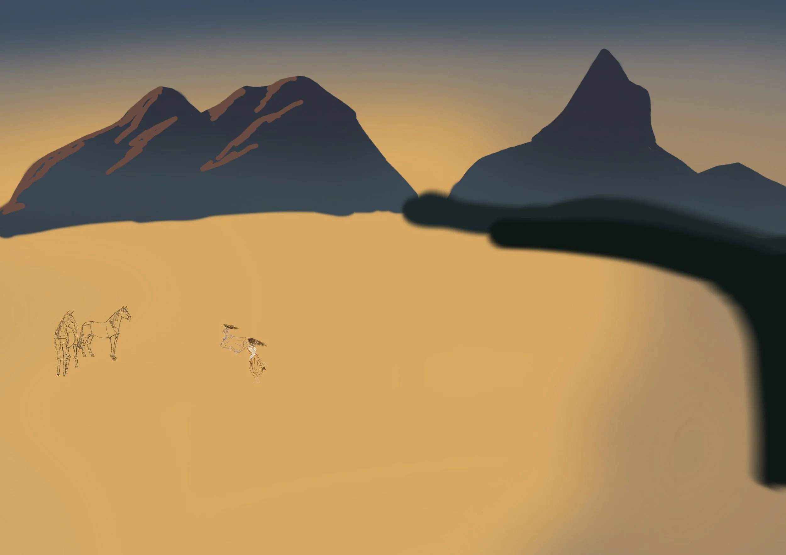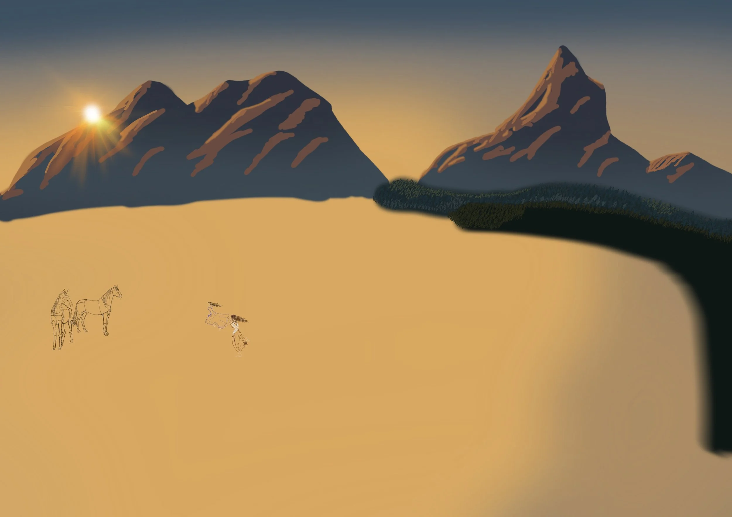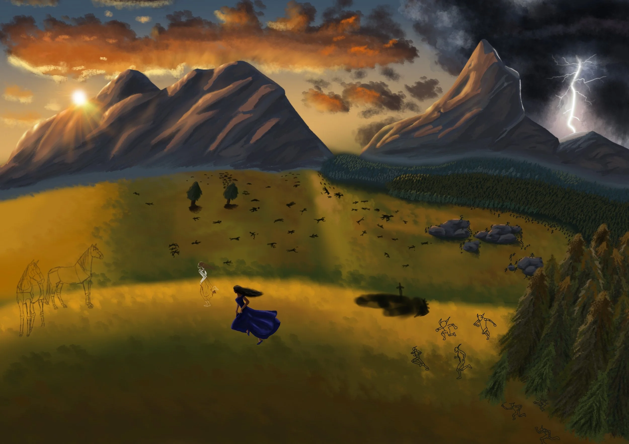 Alongside these things, I had a vision for one side being a beautiful sunshine and the other side to be dark, referencing the impending doom to follow. It mirrors the scene for the sudden drastic change to danger, as well as a contrast between a beautiful scene and a harrowing massacre.