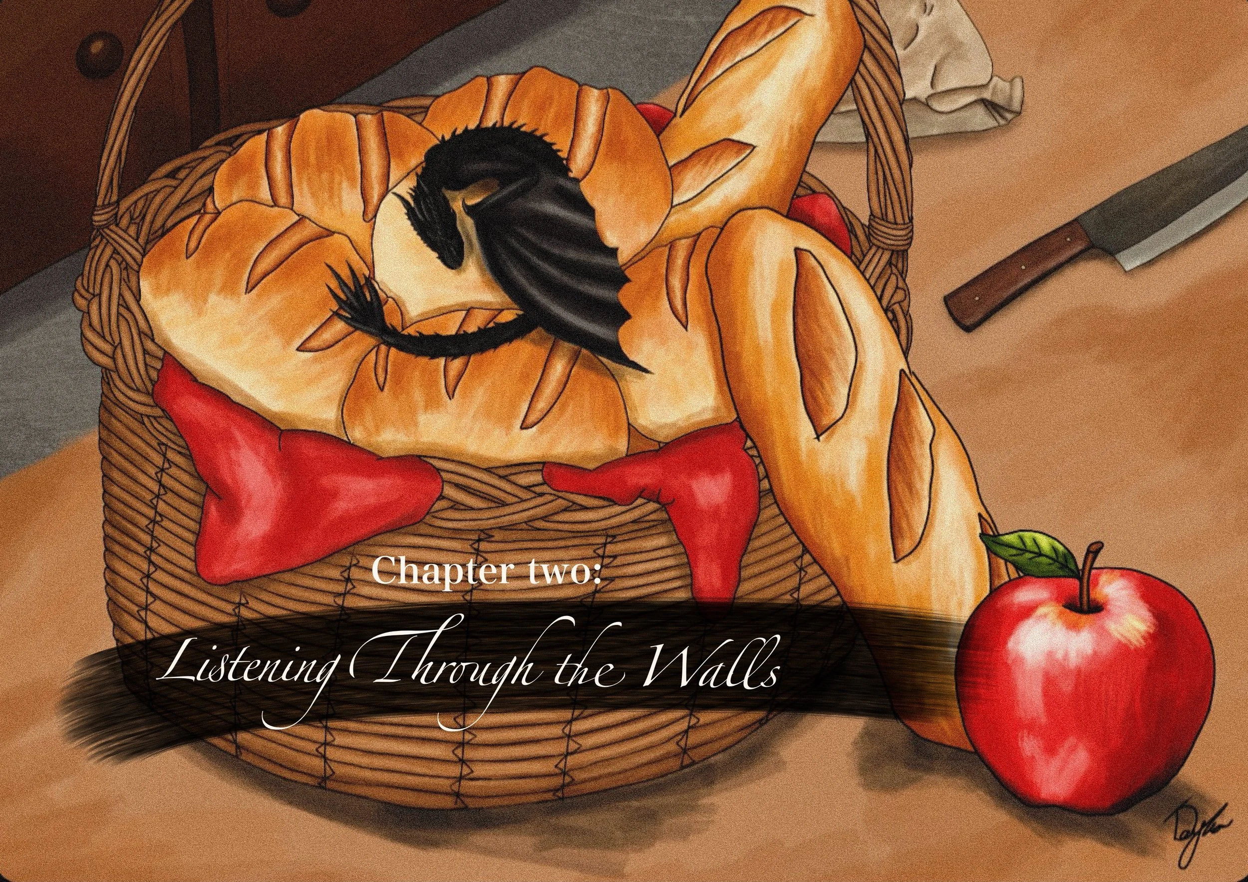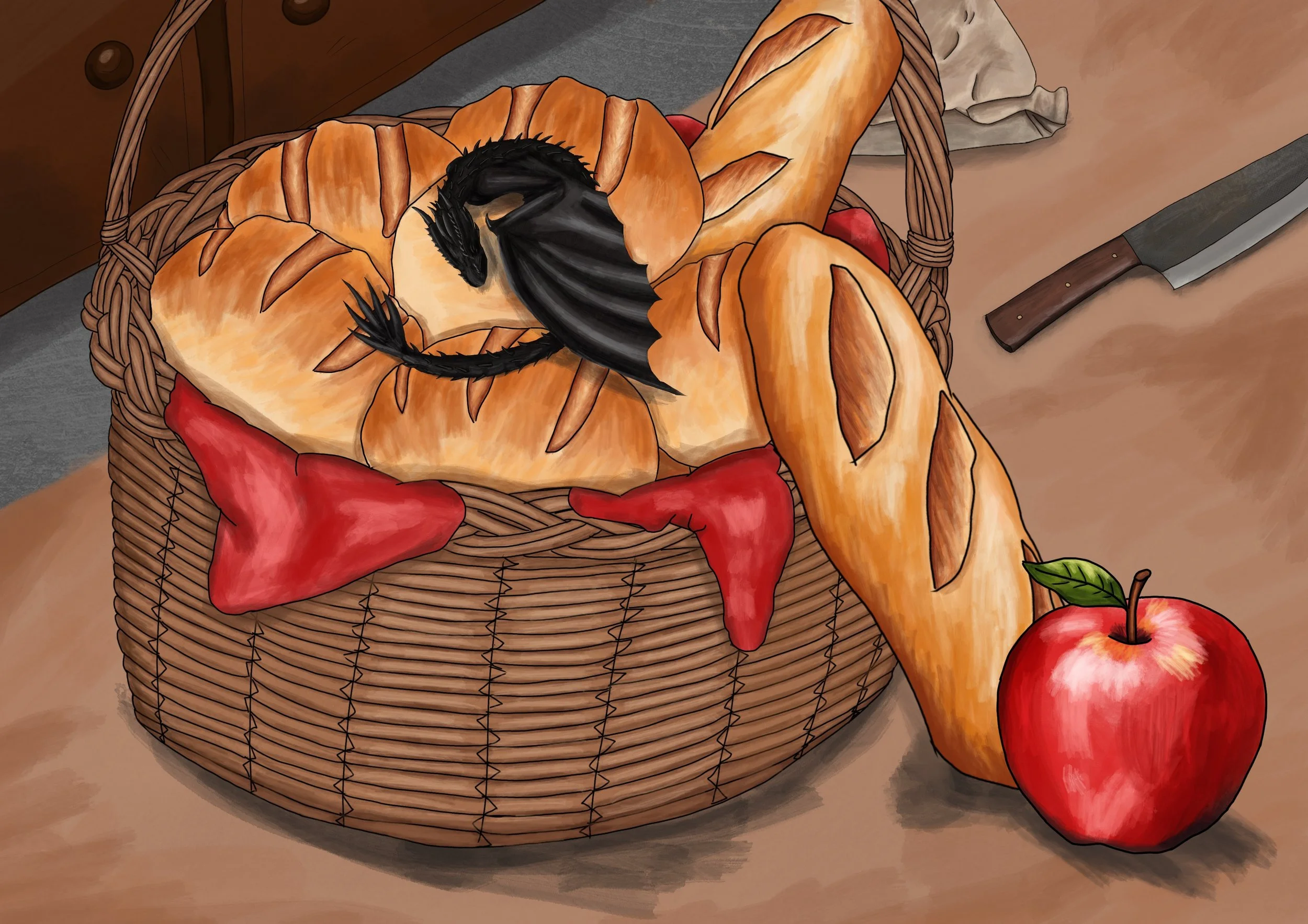 I figured there should be a knife because … well … it’s a kitchen. But also, a knife is symbolic for danger and threat, which is a key part of this story. Murders have taken place within this castle, it is not as wholesome as a cute little dragon in a basket of bread. It’s supposed to remind us that there are threats that lurk behind the scenes.