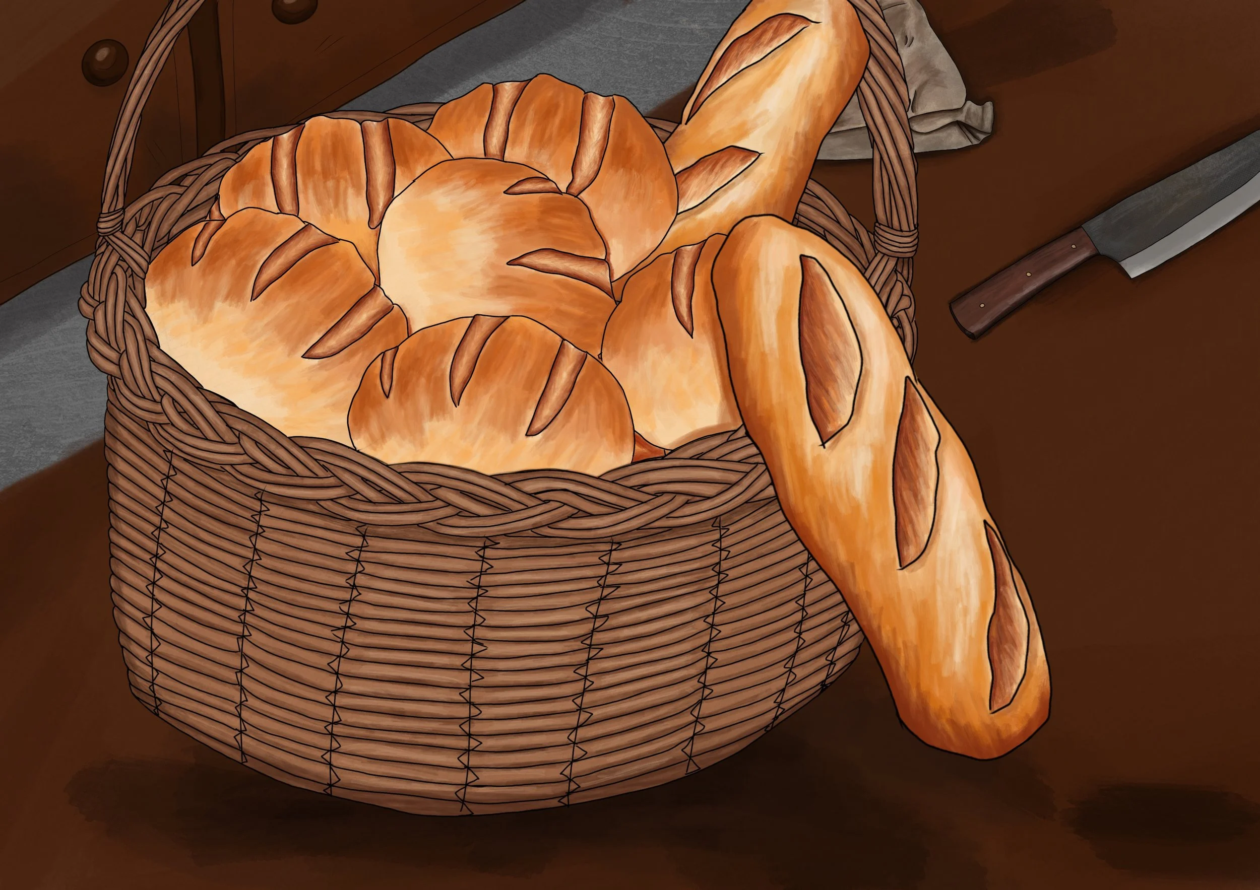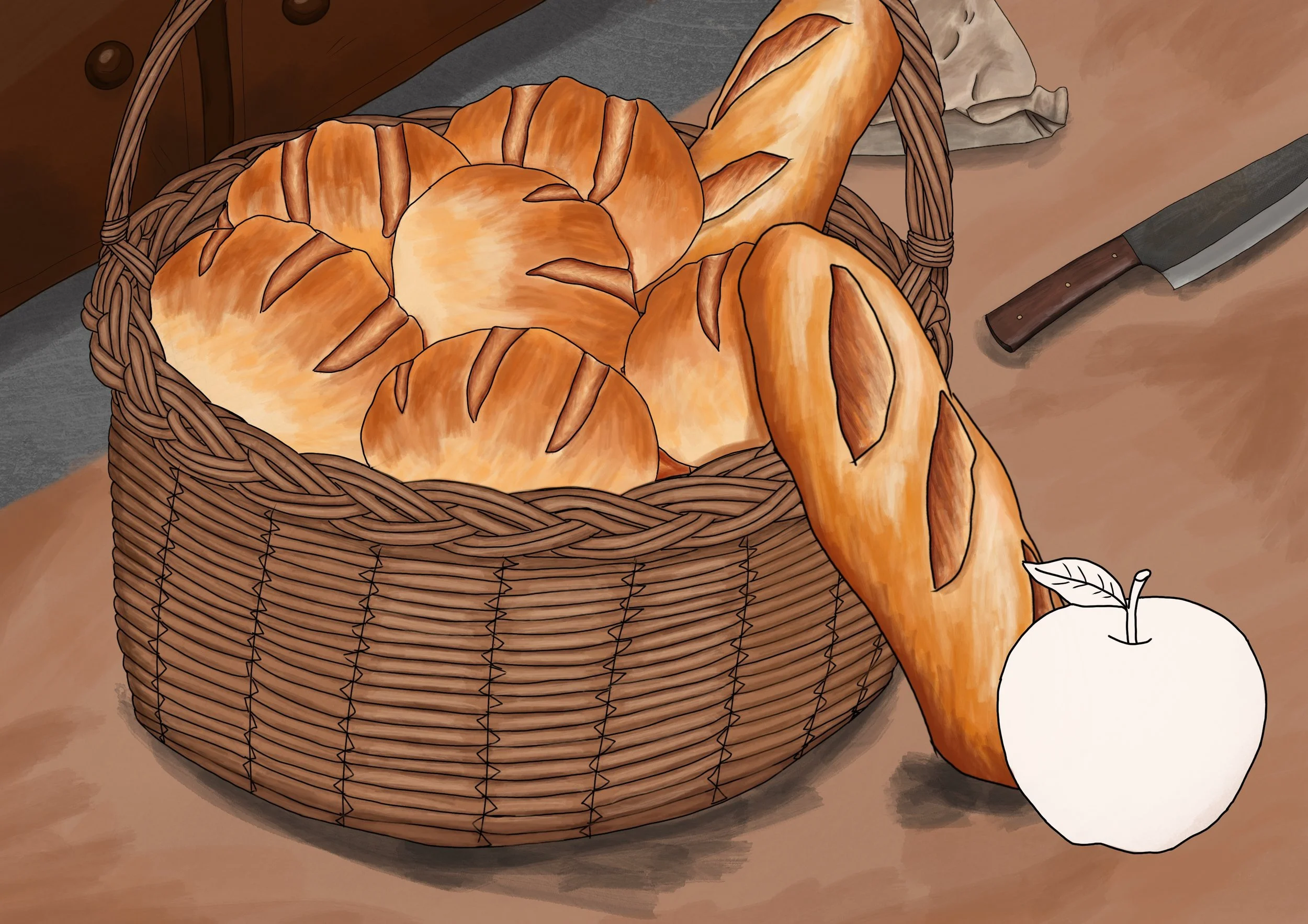In the sketch, I thought I would get away with having the bread revealing one underneath, but perhaps I should have made it darker to get away with it. It didn’t look right to me, so I simply added another roll to the mix. Problem solved. I did add a light dusting of flower but decided that it made the bread look mouldy, so I got rid of it. No one wants mouldy bread.