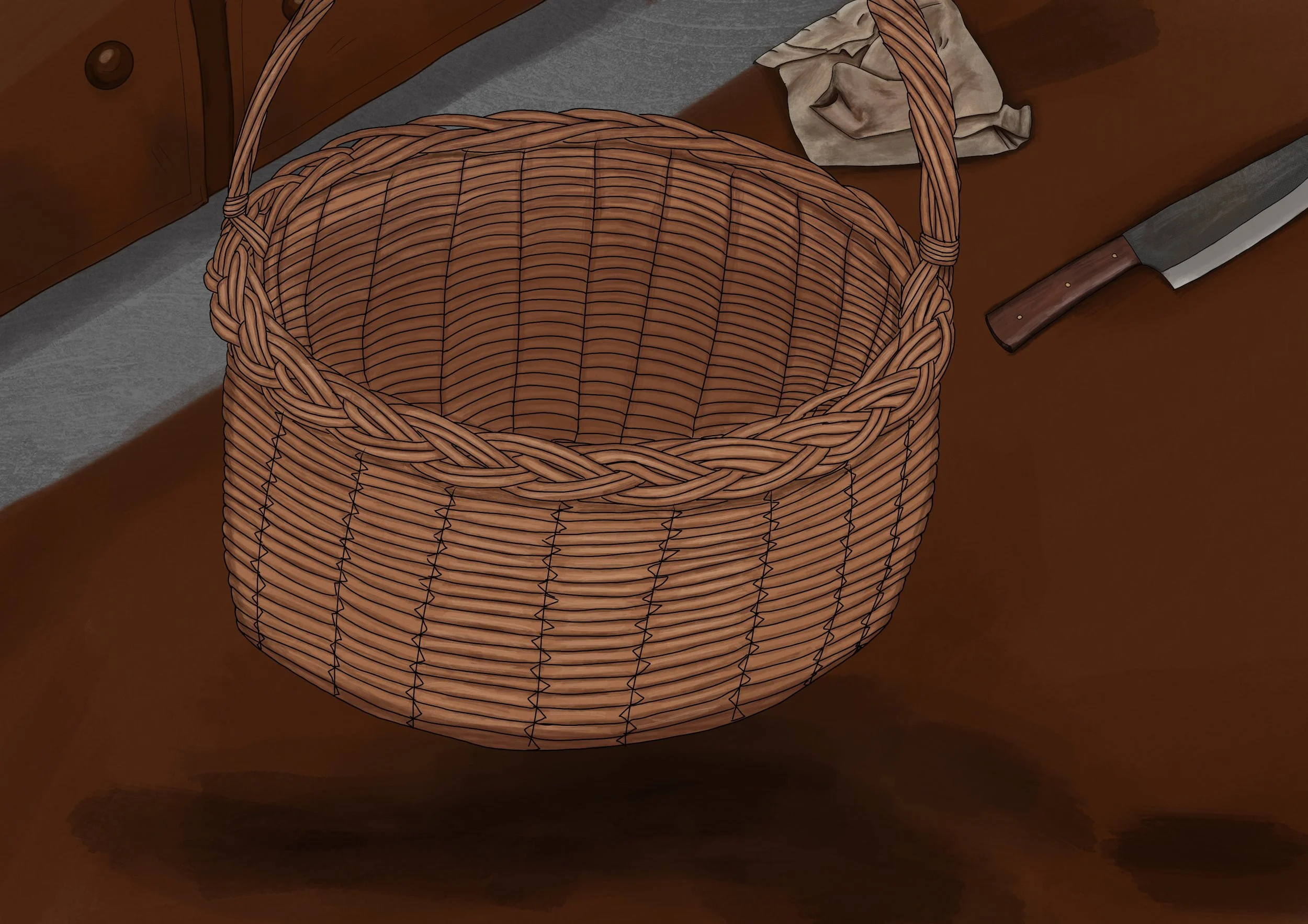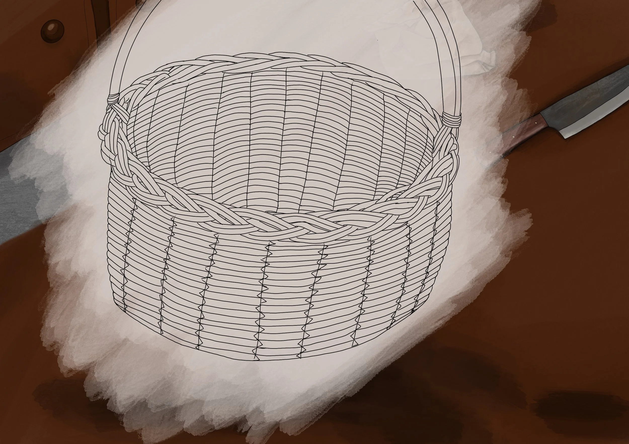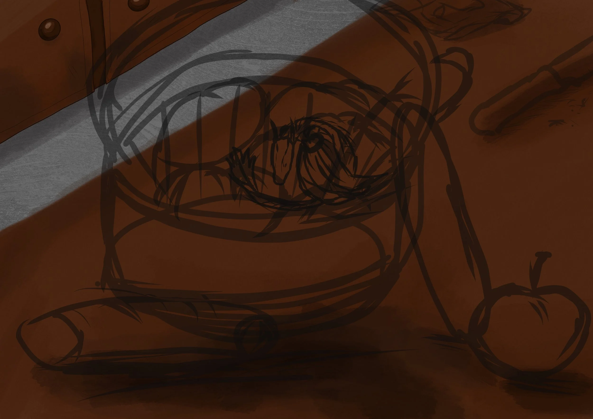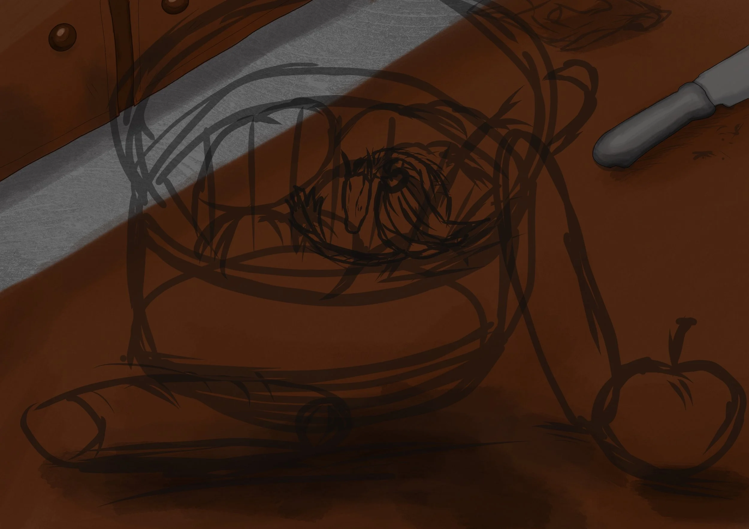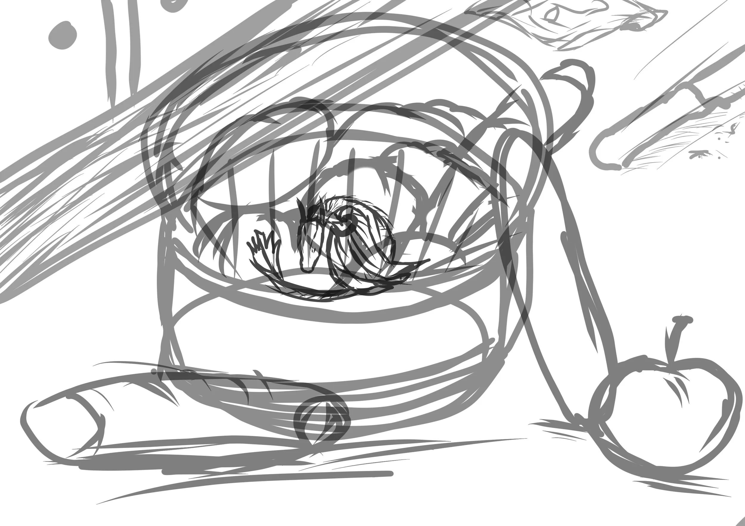 I started off by creating a sketch of the elements I wanted to include within the piece. Obviously, the basket with the dragon, but I figured for a more artistic flair I’d need to add external elements to create dimension. It’s a part of the kitchen which does play as a key role within the book, so I wanted to create life and a story from the state of it.