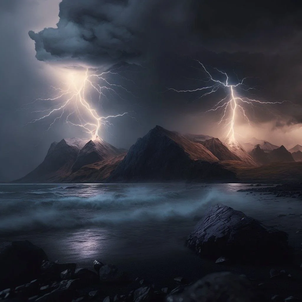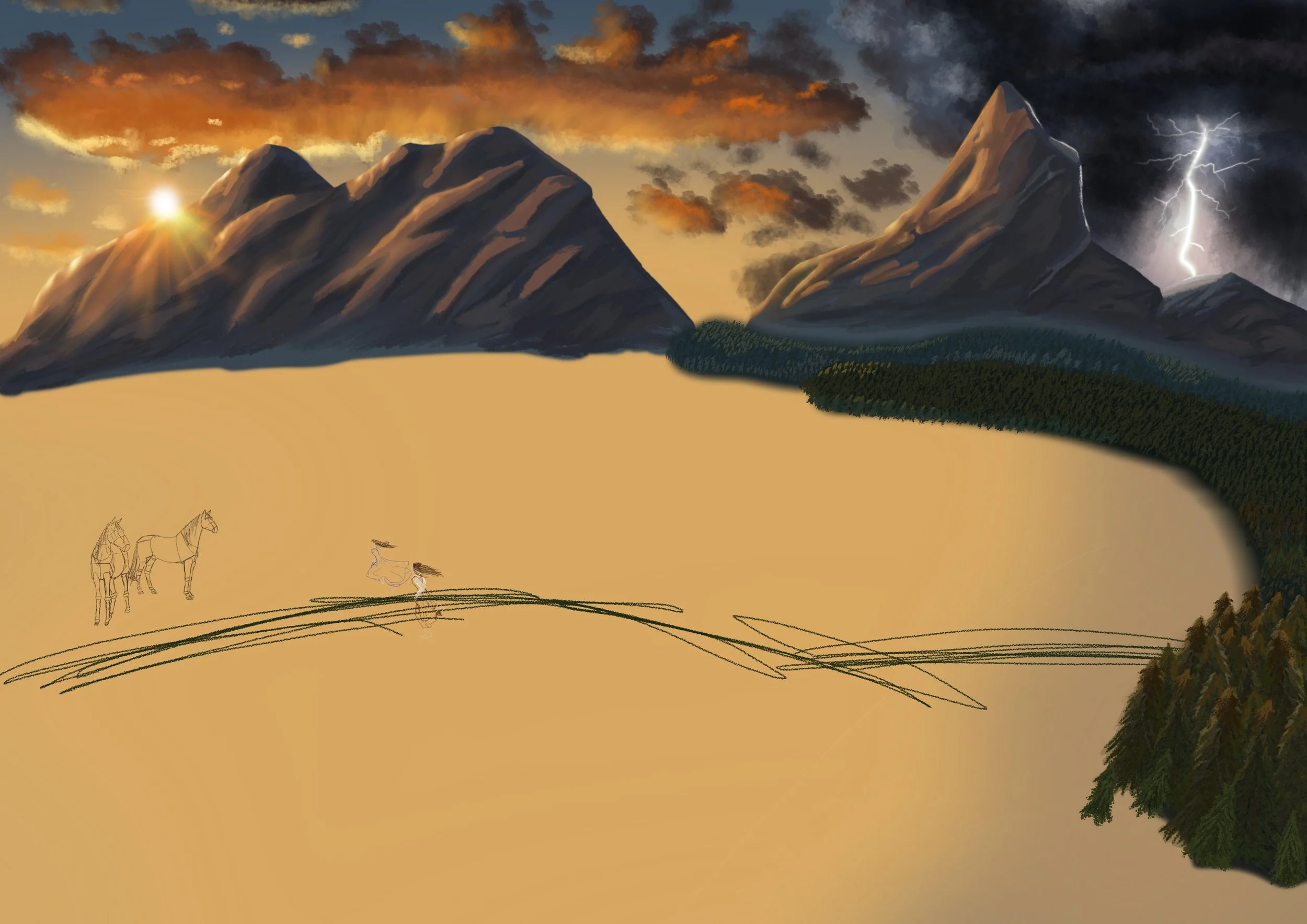 In relation to the scene, it doesn’t specify that there is a lightning strike beyond, but I added this in reference to the storms that keep suddenly appearing, which does follow shortly after this chapter. As for the sunsetting beyond the mountains, well … they’re just pretty, aren’t they?