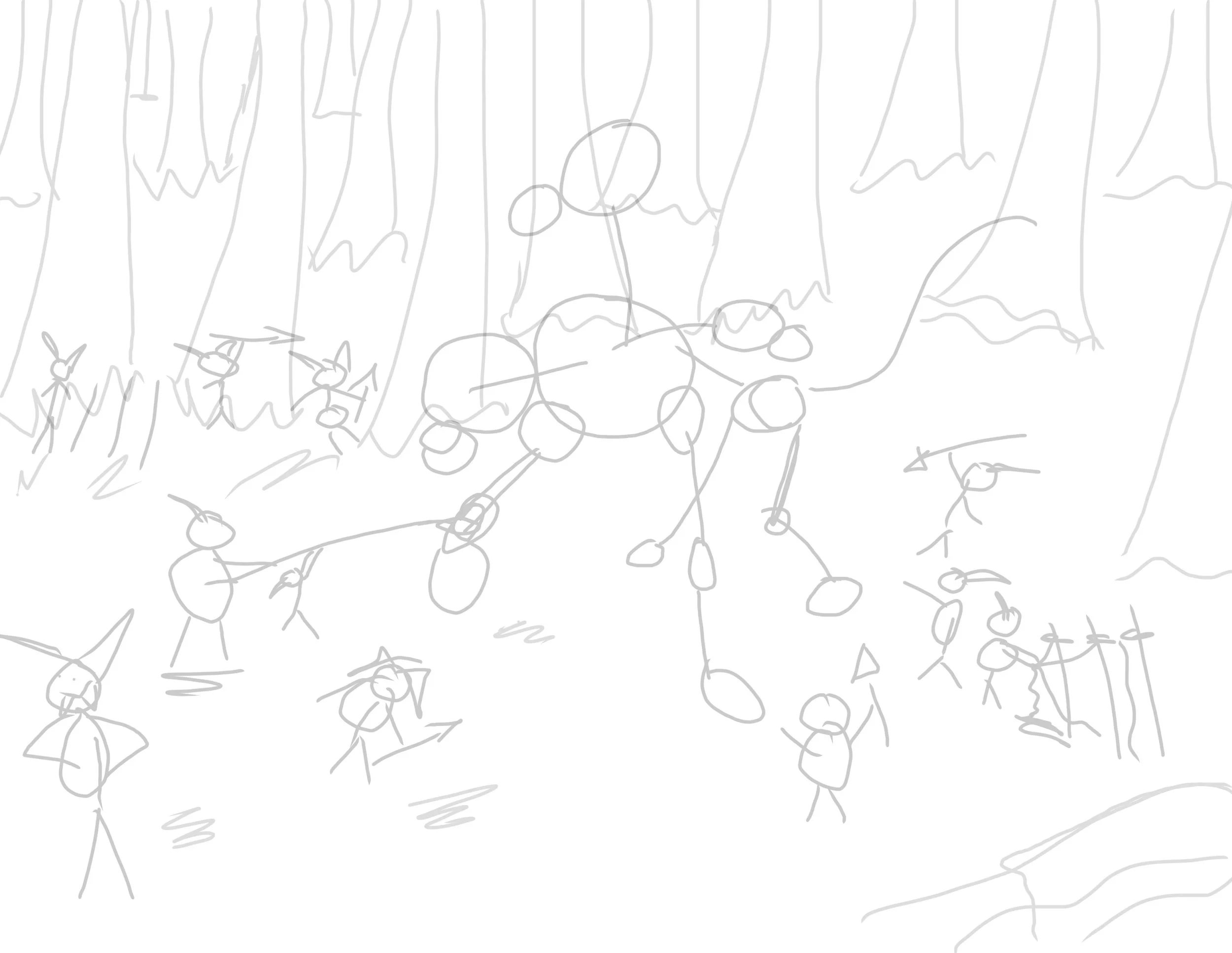 I’d like you to understand the problem with this piece. I started this very early on, and in the process of this piece, my device that I used to draw on had broken. I was without it for several months and in that time, I worked on other things using procreate on my phone. This includes: The House of Bones, The Battlefield, The Cave Dweller (breakdown), The Direwolves and The Dragon in the Basket of Bread. That’s a lot of work before I ever got to return to this piece. And in that time, I learnt a lot of new things. A big example would be to draw backgrounds first. It helps me work on the tones I’d use for the creatures, but in this case I started with the focal point, which now I would tend to avoid. So returning to this piece was a bit jarring for me, but I decided to give it a try to adapt from my naïve ways.
