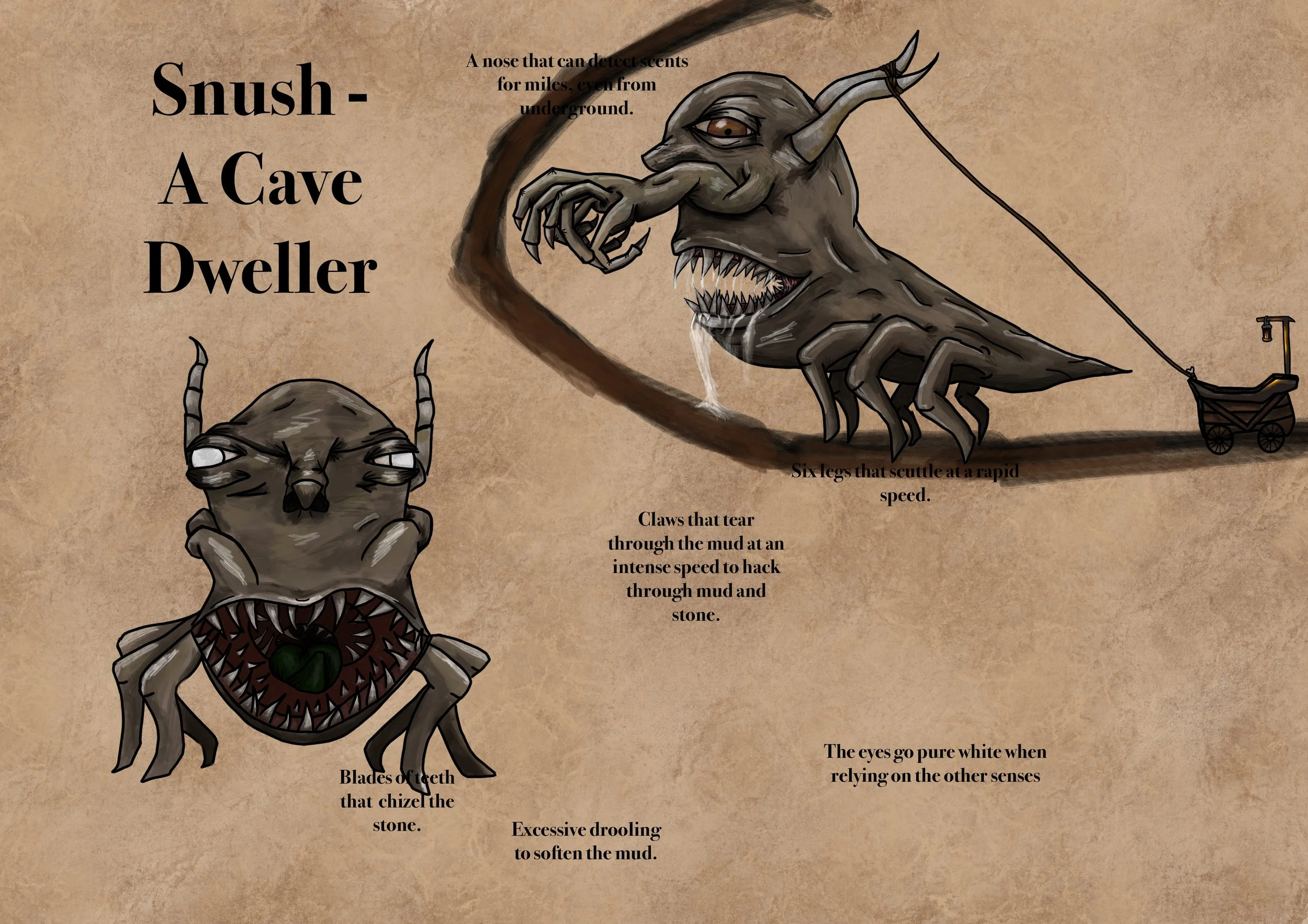 Well, to answer your question, a Snush is typically found in a cave, though in this story, it was located in the tunnels underneath the goblin’s home territory. You see, snushes are known for creating tunnels. They have immeasurable tracking skills, where they helped Borg and Tristian locate Cynthia’s whereabouts after she had disappeared.