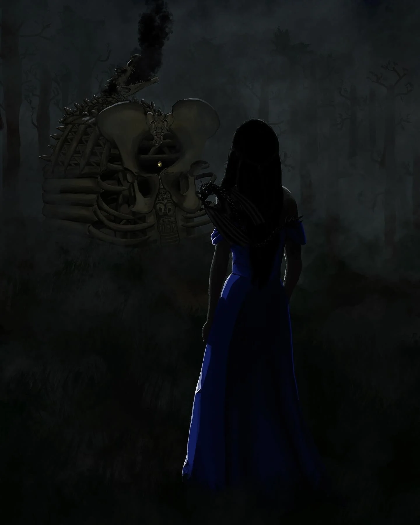 I wasn’t really sure what I was aiming for when I started this. I am not keen on doing character faces, I prefer to leave those details for the readers to imagine, so I knew I wanted Cynthia to look out to the House of Bones, but before I did that, I had to figure out the tone.